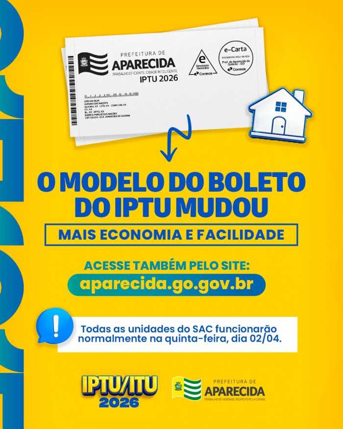 Divulgação A Prefeitura de Aparecida de Goiânia informa que o modelo de cobrança do IPTU (Imposto Predial e Territorial Urbano) passou por alteração neste ano de 2026. No lugar do carnê tradicional, os contribuintes estão recebendo em suas residências uma carta com código de barras no formato boleto para pagamento.