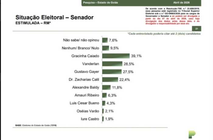 O levantamento ouviu 1.310 eleitores em 60 municípios de Goiás entre os dias 1º e 3 de abril de 2026. A margem de erro é de 2,8 pontos percentuais, com nível de confiança de 95%.