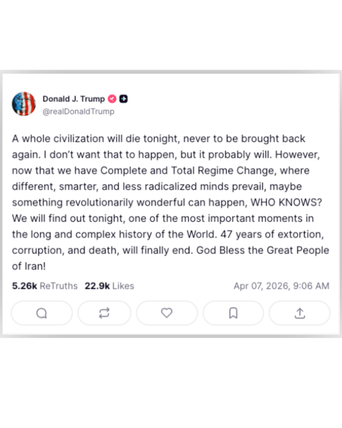 Reprodução O presidente dos Estados Unidos, Donald Trump, afirmou que "uma civilização inteira morrerá nesta noite" ao fazer um post na rede Truth Social nesta terça-feira (7), horas antes do prazo final dado por ele para que o Irã reabra o Estreito de Ormuz.