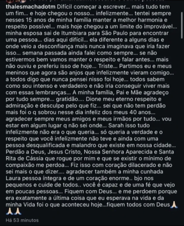 Difícil começar a escrever... mais tudo tem um fim... e hoje chegou o nosso... infelizmente... tentei sempre nesses 15 anos de minha família manter a melhor harmonia e respeito possível... mais hoje chegou a um limite do improvável... minha esposa saiu de Itumbiara para São Paulo para encontrar uma pessoa... dias aqui difícil... ela diferente a alguns dias e onde veio a desconfiança mais nunca imaginava que iria fazer isso... semana passada ainda falei como sempre... se não estivermos bem vamos manter o respeito e falar antes... mais não ouviu e preferiu isso de hoje... Triste... Partimos eu e meus meninos que agora são anjos que infelizmente vieram comigo... a todos digo que nunca pensei nisso foi hoje... todos sabem como sou intenso e verdadeiro e não iria conseguir viver mais com essas lembranças... A minha família, Pai e Mãe agradeço por tudo sempre... gratidão... Dione meu eterno respeito e admiração e desculpe pelo que fiz... sei que não tem perdão mais foi o q sobrou nesse dia infeliz dos meus 40 anos... agradecer sempre meus amigos e meus irmãos por tudo... vou estar em algum lugar q não sei onde... Sarah isso tudo infelizmente não era o que queria... só queria a verdade e o respeito que você infelizmente não teve e ainda com uma pessoa desqualificada e malandro que existe em nossa cidade... Perdão a Deus, Jesus Cristo, Nossa Senhora Aparecida e Santa Rita de Cássia que rogue por mim e que se existir o mínimo de compaixão me perdoa... Fiz isso com coração dilacerado e não sei mais o q dizer.... agradecer também a minha cunhada Laura pessoa íntegra e de um coração enorme.. bjo nos pequenos e cuide de todos.. você é capaz e de uma fé que vejo em poucas pessoas... Fiquem com Deus... e me perdoem porque era exatamente a última coisa que eu esperava na vida e da minha Vida foi o que aconteceu hoje... fiquem todos com Deus🙏🏻🙏🏻🙏🏻