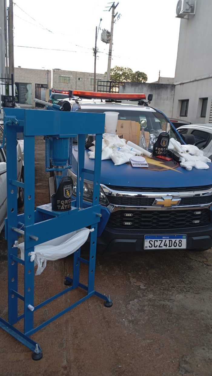 Divulgação/Policia Militar Policiais militares da Força Tática do 45º BPM (Batalhão de Polícia Militar) causaram um prejuízo milionário ao tráfico de drogas na tarde deste sábado (21), em Aparecida de Goiânia. A operação, deflagrada por volta das 16h42, resultou na apreensão de R$ 1,2 milhão em cocaína. A droga foi encontrada no interior de uma residência localizada no Setor Rosa dos Ventos. Além de uma prensa hidráulica, os militares apreenderam insumos e um vasto material utilizado para o preparo e distribuição da substância entorpecente.